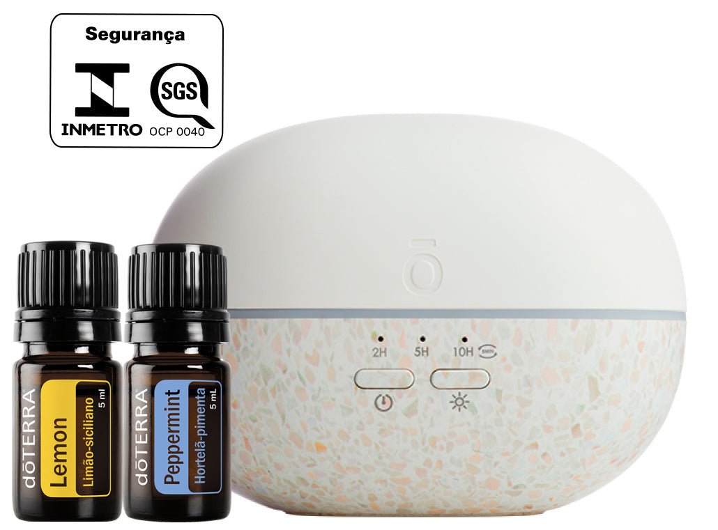 O Kit Difusor Pebble inclui dois dos óleos essenciais mais populares: Peppermint (5 ml) e Lemon (5 ml), perfeitos para energizar e refrescar seus espaços com aromas naturais e revigorantes.